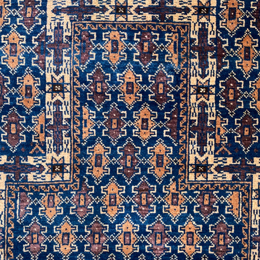 Alfombra de oración tribal azul con motivo de dote