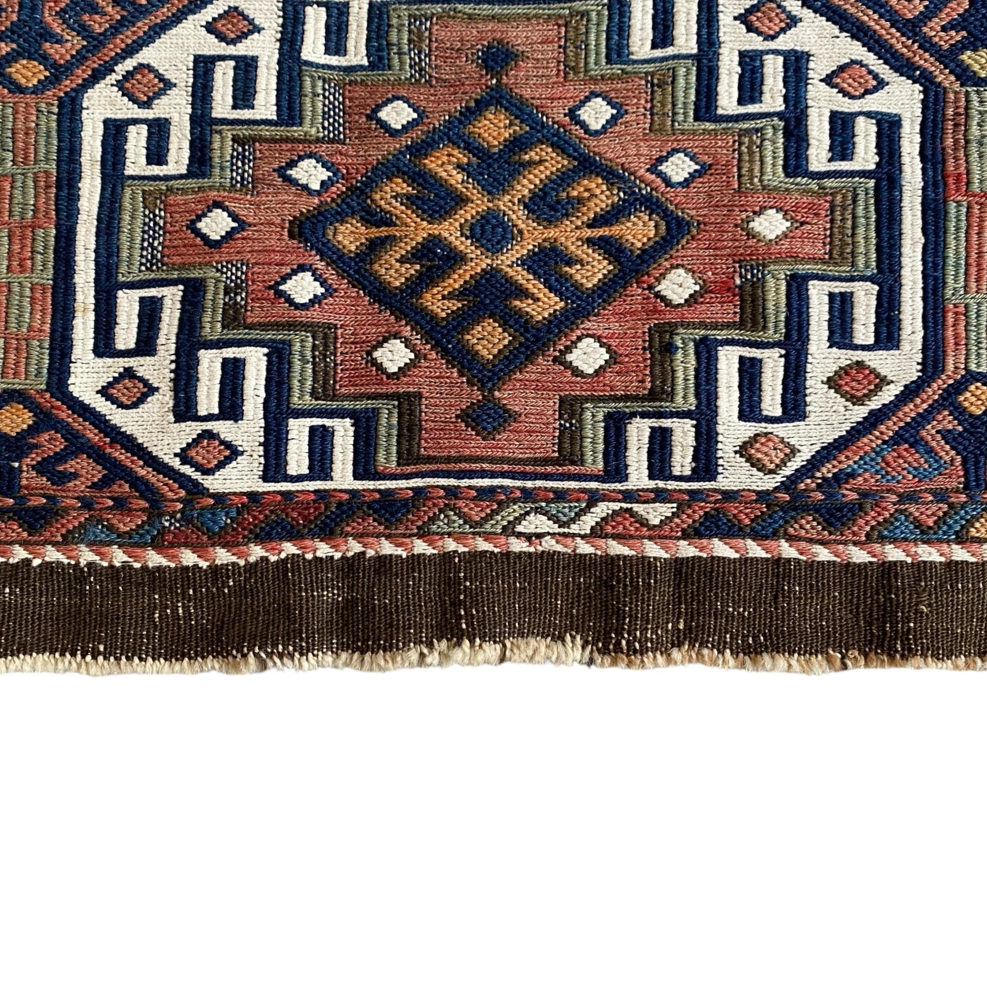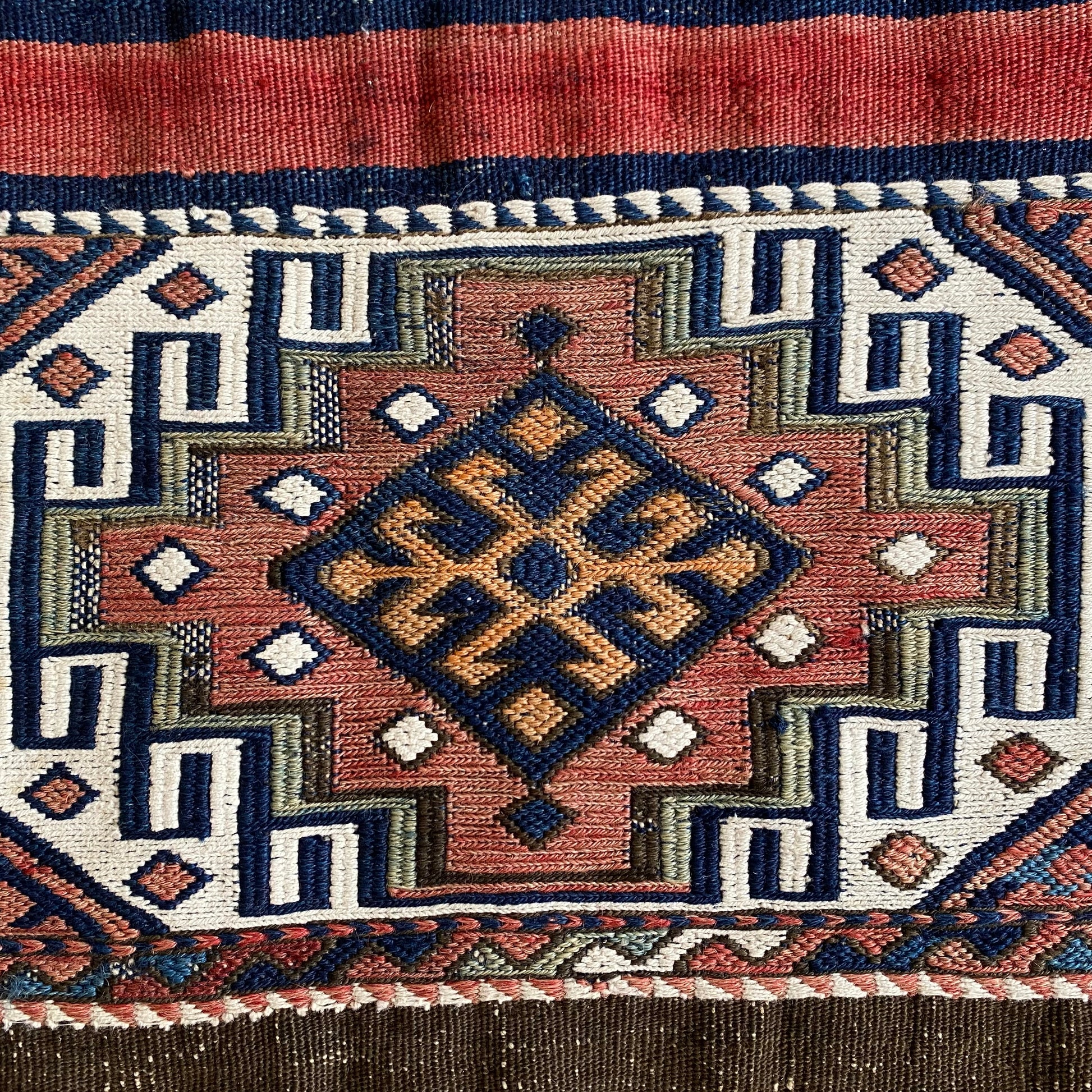 This beautiful Anatolian Tribal Ala Chuval Soumak Kilim Panel has just been professionally cleaned in Türkiye and for future cleaning, this Anatolian Tribal Ala Chuval Soumak Kilim Panel can be washed in the bathtub or on the floor with cold water and natural soap or dry clean. It is ready to be used!